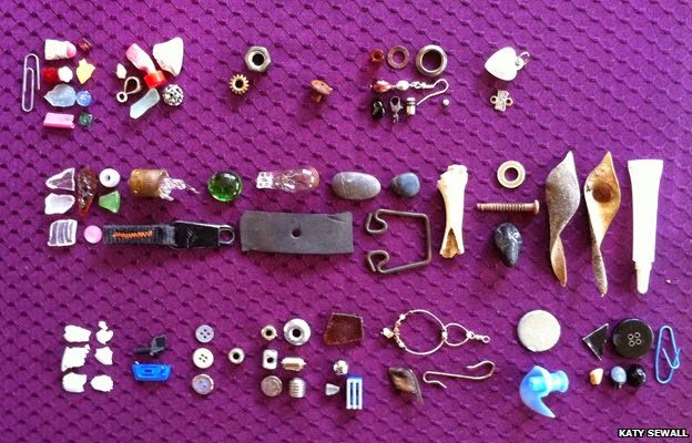 Inside a box are rows of small objects in clear plastic bags. One label reads: "Black table by feeder. 2:30 p.m. 09 Nov 2014." Inside is a broken light bulb. Another bag contains small pieces of brown glass worn smooth by the sea. "Beer colored glass," as Gabi describes it.