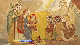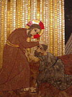 I found a video on line where you can get a better view of these works of art. Photographs do not do the colors justice, especially the sparkling gold. His stunning art makes visible the glory of God and the drama of salvation history.